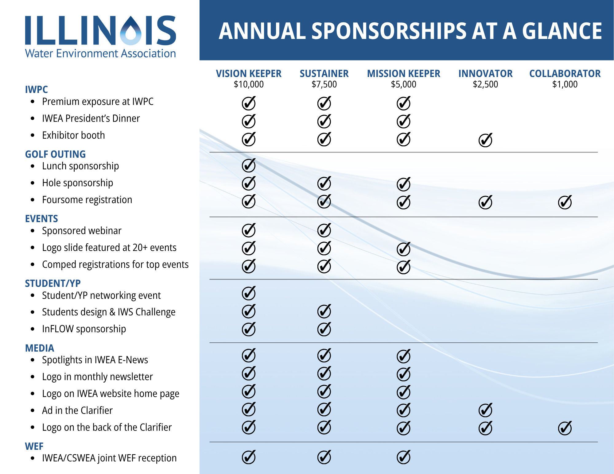 Sponsoring IWEA not only gives your company recognition at multiple IWEA events throughout the year, but also demonstrates your company’s commitment to working together to enrich the Illinois water community and increase awareness of the impact and value of water.